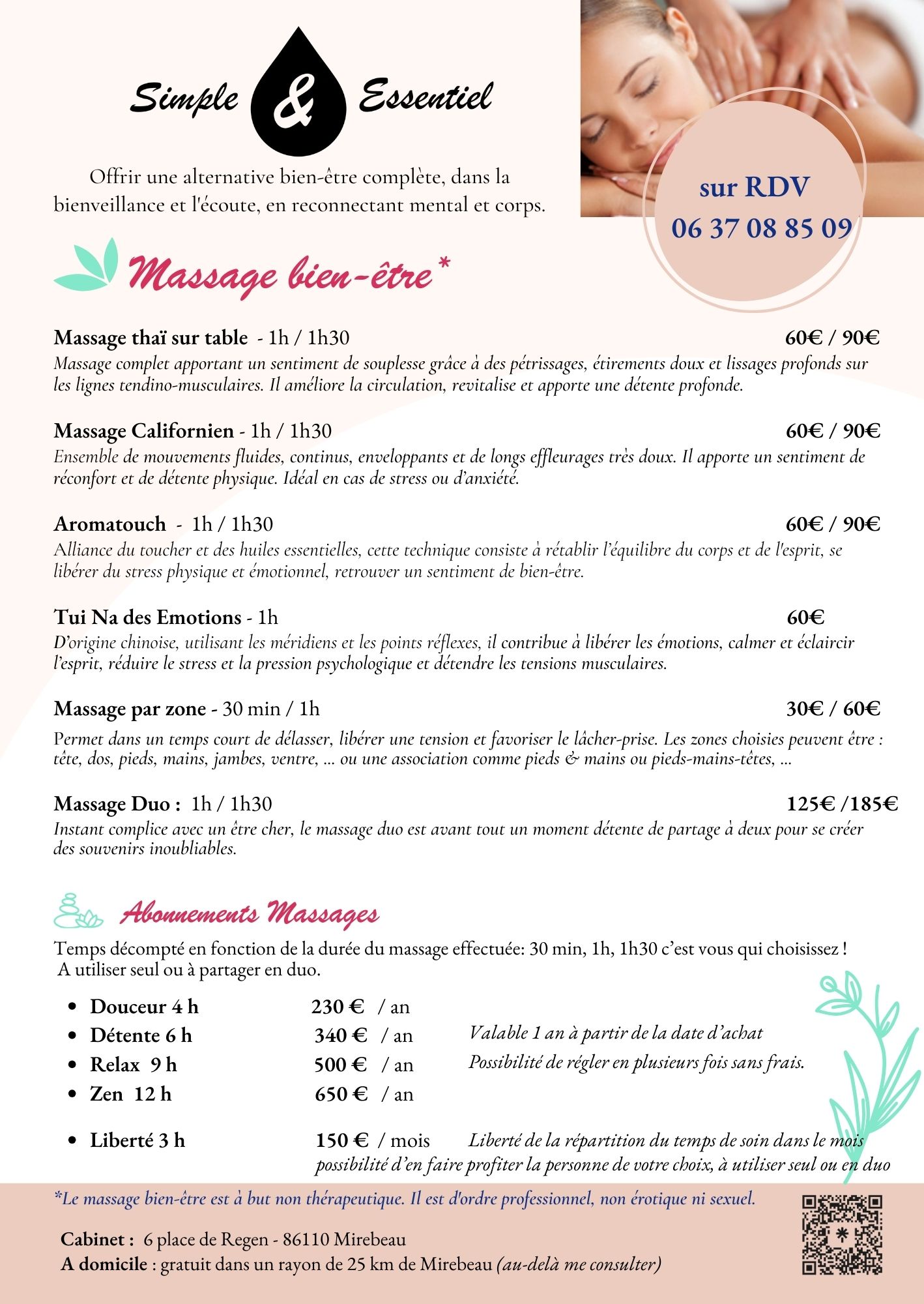 *Le massage bien-être est à but non thérapeutique. Il est d’ordre professionnel, non érotique ni sexuel.